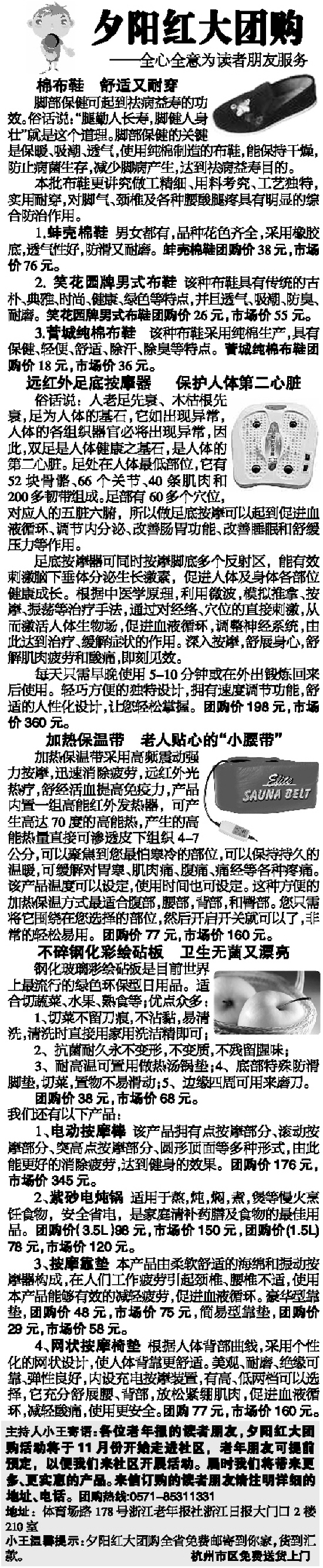 主持人小王寄语:各位老年报的读者朋友,夕阳红大团购活动将于11月份开始走进社区,老年朋友可提前预定,以便我们来社区开展活动。届时我们将带来更多、更实惠的产品。来信订购的读者朋友请注明详细的地址、电话。团购热线:0571-85311331
