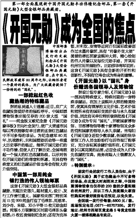 据发行处的发行工作人员告知,由于《开国元勋》属于红色藏品中不可多得的珍品,在此重大时刻到来之际,中国邮票博物馆拿出仅存的200套的少量配额在杭州发行,所以工作人员提醒大家前往购买时最好提前电话预定,以免失望。