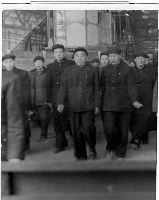 柳长斌(前右一)陪同朱德在北满钢厂轧钢车间视察。
