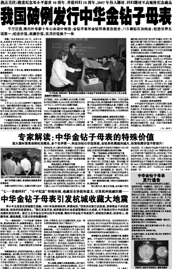 近日,一部纪念小平逝世十周年、香港回归十周年的高规格纪念藏品“中华金钻子母表”隆重问世,并特别把浙江作为发行省份。据了解,中华金钻子母表是耗巨资、海内外专家10年心血精心设计打造的惊世杰作,已申请专利。它破天荒地把“伟人题材、回归题材”完美融合在一起,不仅寓意小平是“中国人民的儿子”,还体现香港和祖国子母连心、共同繁荣昌盛。用纯金和钻石表达最特殊、最珍贵、最永恒的纪念。
