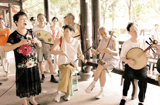 温州市区中山公园有一个京剧兴趣小组,三年来,坚持每天上午开展京剧大家唱活动,成了五六十名京剧爱好者自娱自乐的乐园。图为8月5日上午,京剧票友在自娱自乐。