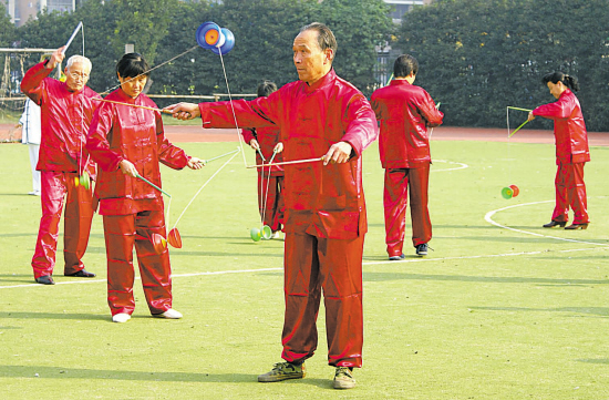 近日,杭州凯旋街道举办“迎奥运精神、展老年风采”企业退休工人运动会。老年人分别进行了广播操、空竹和太极拳集体特色项目的表演,还进行了单项滚铁环、扔飞镖、跳绳、乒乓球和象棋等比赛。全街道13个社区500余名运动员参加。沈爱群 摄