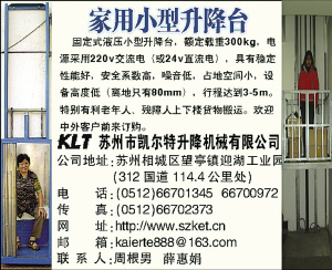 固定式液压小型升降台,额定载重300kg,电源采用220v交流电(或24v直流电),具有稳定性能好,安全系数高,噪音低,占地空间小,设备高度低(离地只有80mm),行程达到3-5m。特别有利老年人、残障人上下楼货物搬运。欢迎中外客户前来订购。