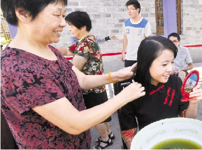 日前,一些爱美的姑娘来到宁波市海曙区南塘老街,体验用木槿叶汁洗头的感觉。当天开始,南塘老街陆续推出“七夕”老宁波系列风俗活动,让市民在参与中回味亲情、友情和乡情。