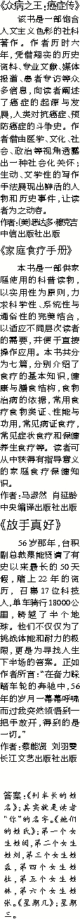 答案:《列车长的姓名》:其实就是读者“你”的名字。《她们的姓氏》:第一个女生姓闵,第二个女生姓刘,第三个女生姓孟,第四个女生姓杜,第五个女生姓林,第六个女生姓张。《星期几》:星期三。