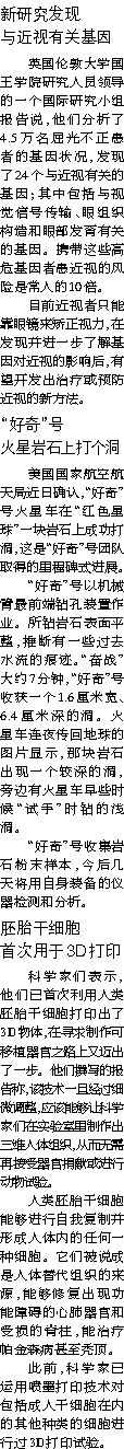 英国伦敦大学国王学院研究人员领导的一个国际研究小组报告说,他们分析了4.5万名屈光不正患者的基因状况,发现了24个与近视有关的基因;其中包括与视觉信号传输、眼组织构造和眼部发育有关的基因。携带这些高危基因者患近视的风险是常人的10倍。