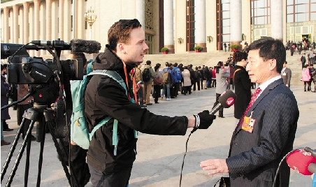 外国记者采访我省全国人大代表。 本报记者 周咏南 摄