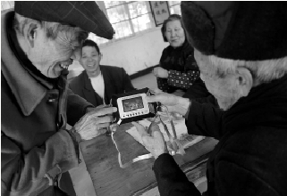 3月5日,笔者在衢州市柯城区万田乡余家山村村村里的老年文体活动室看到,村民郑才良(左)自己刚买的“电视机”给村民赏析。大伯告诉我们,小电视很好,他化了300多元买的,他随身背着,下地干活也听,串门做客都能随时播放,能贮存150多部戏剧,充一下电可以看上好几天。 鲍卫东摄