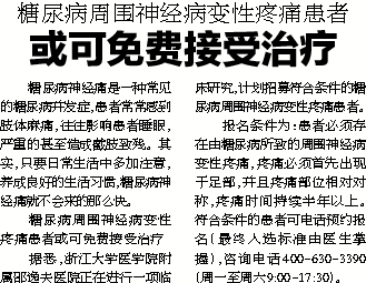 据悉,浙江大学医学院附属邵逸夫医院正在进行一项临床研究,计划招募符合条件的糖尿病周围神经病变性疼痛患者。