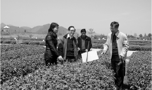 丽水市老科协专家在松阳县茶叶基地介绍茶信息素诱捕害虫情况。 潘永年 摄