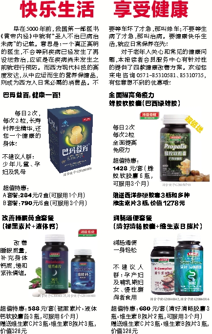 对于老年人关心和常见的健康问题,本报读者会员服务中心有针对性的提供了四款健康改善方案。欢迎您来电咨询0571-85310581、85310735,有您意想不到的优惠哦!