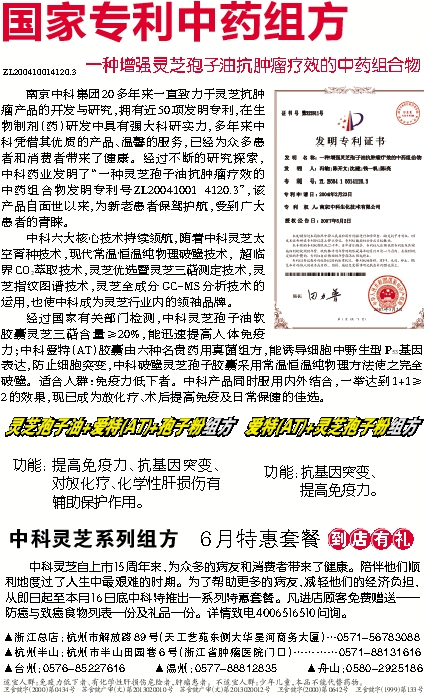 南京中科集团20多年来一直致力于灵芝抗肿瘤产品的开发与研究,拥有近50项发明专利,在生物制剂(药)研发中具有强大科研实力,多年来中科凭借其优质的产品、温馨的服务,已经为众多患者和消费者带来了健康。经过不断的研究探索,中科药业发明了“一种灵芝孢子油抗肿瘤疗效的中药组合物发明专利号ZL20041001 4120.3”,该产品自面世以来,为新老患者保驾护航,受到广大患者的青睐。