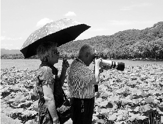 40℃的高温挡不住一对老夫妻的娱乐心情。断桥上,一位老先生拿着相机在荷塘边拍摄。他走到哪里,身后的老太太就撑着伞跟到哪里。为了让老伴能专心拍摄,老太太在后面一直用伞为他挡着强烈的阳光。