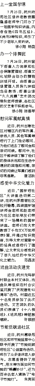7月26日,杭州留下街道人力资源和社会保障管理站、街道文化站联合创办的舞培训班开班。由街道企退管理人员陈九妹担当总教练、街道企退“久久流霞”艺术团沈君秋老师授课,各社区的文艺骨干积极参与。
