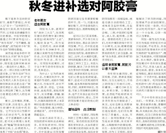阿胶与人参、鹿茸并称“滋补三大宝”,我国现存最早的药物专著《神农本草经》将其列为“上品”,久服轻身益气,养性延年。它的药用、滋补保健历史距今有2500多年,自北魏以来即为进贡朝廷的珍品,历代皇家贵族都把阿胶作为贡品,养生滋补。用阿胶制成膏剂,对于这个季节的老年朋友来说,尤其适合。