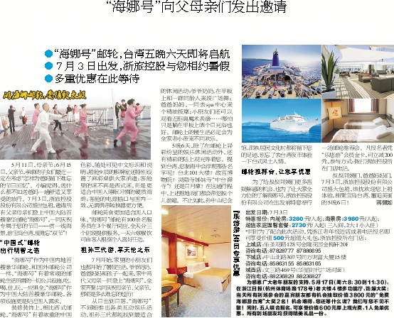 为感恩广大老年朋友的支持,5月17日(周六8:30到11:30),在浙江日报(杭州体育场路178号)老大楼4楼多功能厅,劲爆大奖:当天所有到场参会的嘉宾朋友都有机会抽取价值3800元的“免费海娜游台湾”大奖2名!机会难得,您还等什么呢?我们与您不见不散!同时,五人组合报名,可享受价值600元岸上观光费,1人免单优惠。所有到场朋友均获得精美礼品一份。