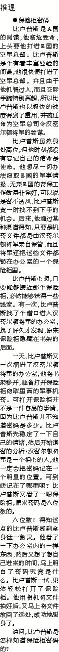 一天,比卢普斯又一次溜进了汉密尔顿将军的办公室,他将书架移开,准备打开保险柜窃取里面的军事机密。可打开保险柜并不是一件容易的事情,因为比卢普斯并不知道密码是多少。比卢普斯先稳定了一下自己的情绪,然后开始缜密的分析:汉密尔顿将军是一个粗心的人,他一定会把密码记在一个明显的位置。可到底记在了哪里呢?比卢普斯又看了一眼保险柜,原来密码是八位数的。