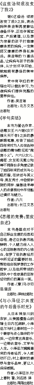 继《这些汤 彻底改变了我》之后,煲汤妈咪吴吉琳再度献给准备怀孕、正在孕育宝宝、产后调理,以及想为亲爱的孩子打造健康体质的妈妈,一生美丽又健康的养身私房汤。吴吉琳的73道汤品,让妈妈与孩子的身体,从计划怀孕开始,就能拥有最佳的美味保养。