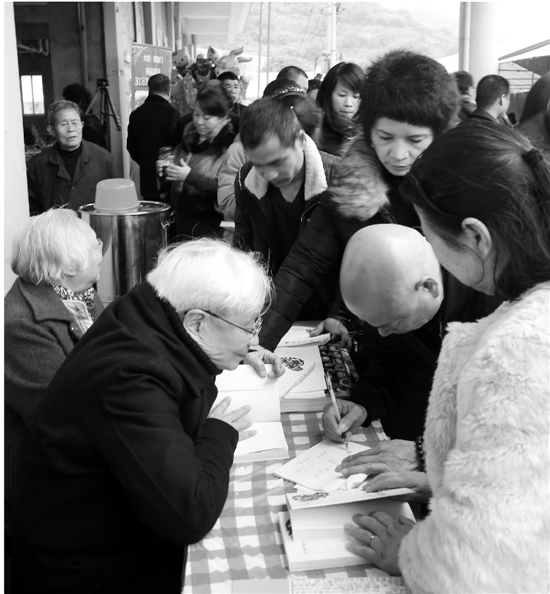 周荣光夫妇一起在周岙挑灯节推介“纸农菜”