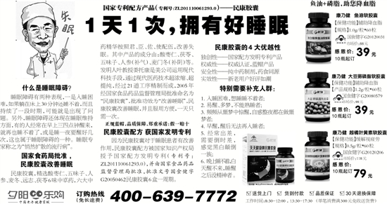 因为民康胶囊对于睡眠患者有改善作用,民康胶囊配方被国家知识产权局授予国家配方发明专利(专利号:ZL201110061293.0),并由国家食品药品监督管理局批准,批准文号国食健字G20050462民康胶囊6盒一周期。