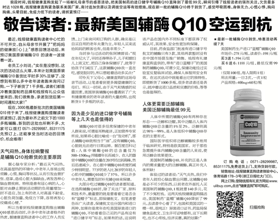 前段时间,钱报健康直购发起了一场献礼母亲节的感恩活动,把美国制药的进口健字号辅酶Q10直降到了最低99元,瞬间引爆了钱报读者的强烈关注,欠货最多时达1028瓶,钱报健康直购紧急联系美国厂家,商讨追加货源以及调拨空运等有效措施,现在新一批的辅酶Q10终于到货了,感觉呼吸困难、身体无力、心慌心悸、胸闷胸痛、头晕目眩、免疫力低下的读者,请抓紧预订……
