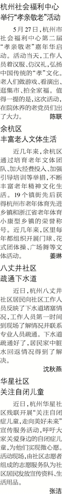 5月27日,杭州市社会福利中心第二届“孝亲敬老”嘉年华启动。活动当天,工作人员着汉服、仿汉礼,弘扬中国传统的“孝”文化。老人们做游戏、看演出、逛集市、拍全家福。值得一提的是,这次活动,在院休养的老党员们出了大力。 陈联