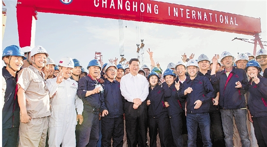 习近平在长宏国际船舶修造有限公司与现场工人们合影