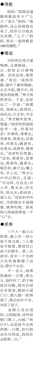 三个人一起上山抓熊,晚上在一间小屋子里过夜,三人谁也不服谁,都说自己是个好猎手。第二天清早,其中一个为抢占先机偷偷溜了出去,想立个头功。