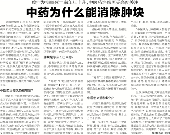 全国肿瘤登记中心近日发布2015年年报,过去10年我国癌症发病率和死亡率呈现出明显上升趋势,让中医药治疗癌症,再一次受到社会的高度关注:中医药治癌,为何有独特疗效?中药为什么能消除肿块?对此,中华中医药学会肿瘤分会委员、杭州艾克(种福堂)、武汉艾克中医院院长孙彩珍认为,我国每年新增癌症病人几百万个,相当于每分钟就有6个人得癌。正是这种严峻的“癌情”和不断上升的死亡率,让很多人把目光投向了祖国传统医学——中医药。“确实,中医药治癌具有独特的优势。它在消除肿块、缓解症状、延长生存期方面,正在发挥着难以替代的作用。”孙院长说。