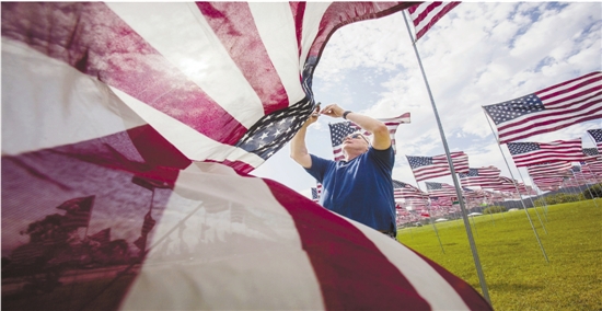 在美国加利福尼亚州洛杉矶县马利布,一名志愿者竖起旗帜。在美国“9·11”事件14周年之际,佩珀代因大学的学生和教职员工在学校草坪上竖起约3000面美国国旗,纪念“9·11”事件遇难者。 新华社发