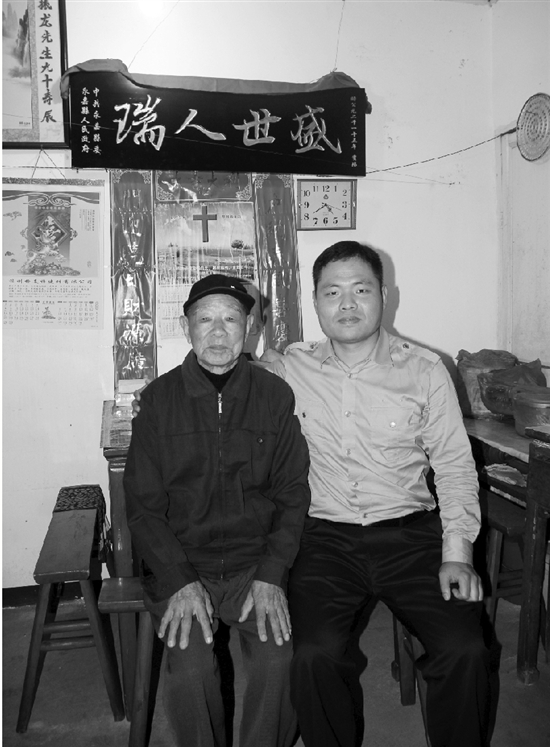 徐振龙与孙子徐旭海。堂中悬挂着“盛世人瑞”的匾额。