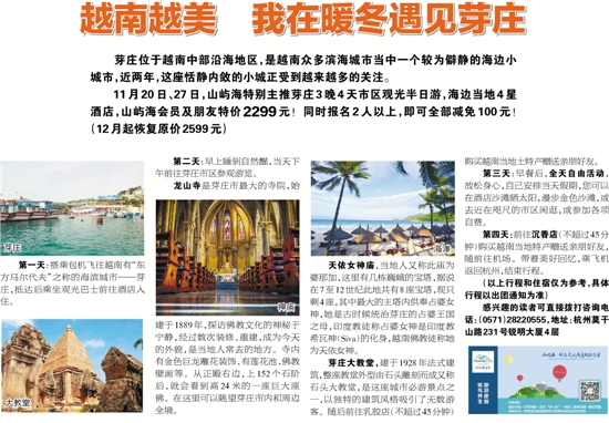 11月20日、27日,山屿海特别主推芽庄3晚4天市区观光半日游,海边当地4星酒店,山屿海会员及朋友特价2299元!同时报名2人以上,即可全部减免100元!(12月起恢复原价2599元)