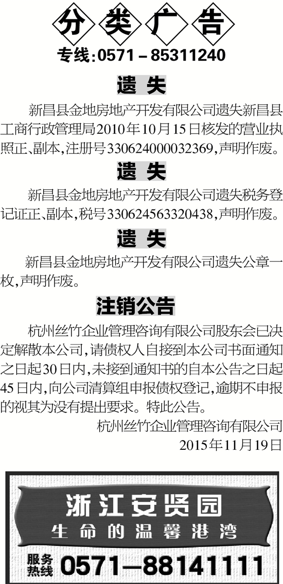 新昌县金地房地产开发有限公司遗失税务登记证正、副本,税号330624563320438,声明作废。