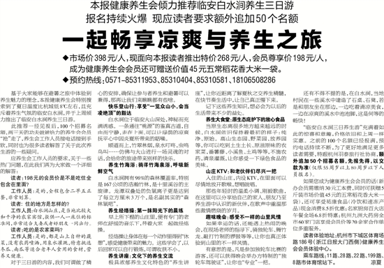 基于大家能够在避暑之旅中体验到养生魅力的理念,本报健康养生会特别搜索到了夏日温度比杭城低8℃左右,且充斥着养生气氛的临安白水涧,并于上周倾力推出了临安白水涧养生三日游。