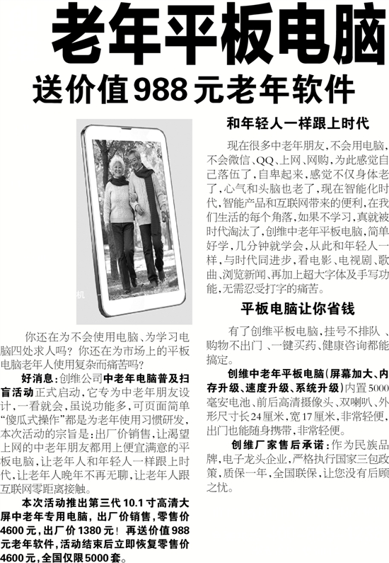 好消息:创维公司中老年电脑普及扫盲活动正式启动,它专为中老年朋友设计,一看就会,虽说功能多,可页面简单“傻瓜式操作”都是为老年使用习惯研发,本次活动的宗旨是:出厂价销售,让渴望上网的中老年朋友都用上便宜满意的平板电脑,让老年人和年轻人一样跟上时代,让老年人晚年不再无聊,让老年人跟互联网零距离接触。