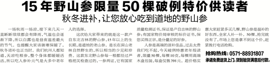人参是高端的滋补佳品,过去太贵我们吃不起,今天破例特惠老年报读者,限量50棵,每棵10克,每棵用高端木盒包装,每盒仅售398元。趁价格实惠大家赶紧多买几棵,野山参是温补的好东西,全家人补一补。50棵,抢完就没有了,市场上您是拿不到这个价,赶紧拨打电话抢购。