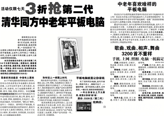 清华同方公司(中老年电脑普及扫盲活动)正式启动,本次活动的宗旨是:成本价销售,一台也是出厂价,让渴望上网的中老年朋友都用上便宜满意的平板电脑,让老年人和年轻人一样跟上时代,让老年人晚年不再无聊,让老年人跟互联网零距离接触。