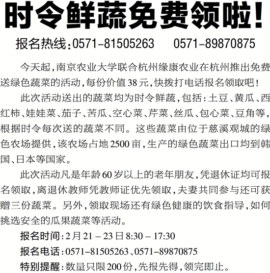 今天起,南京农业大学联合杭州缘康农业在杭州推出免费送绿色蔬菜的活动,每份价值38元,快拨打电话报名领取吧!