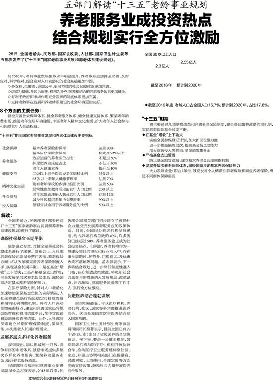 28日,全国老龄办、民政部、国家发改委、人社部、国家卫生计生委等五部委发布了《“十三五”国家老龄事业发展和养老体系建设规划》。