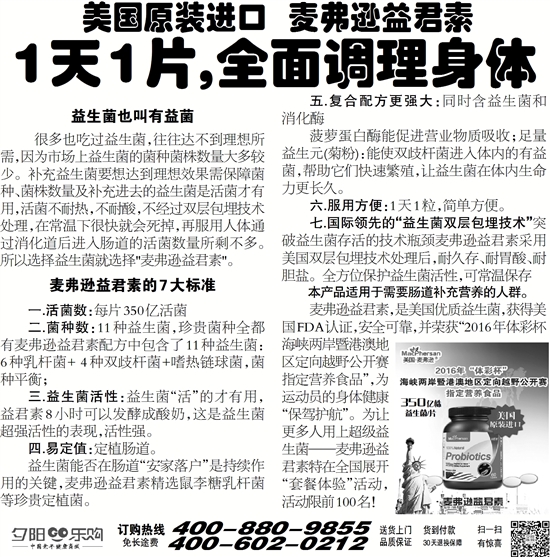 麦弗逊益君素,是美国优质益生菌,获得美国FDA认证,安全可靠,并荣获“2016年体彩杯海峡两岸暨港澳地区定向越野公开赛指定营养食品”,为运动员的身体健康“保驾护航”。为让更多人用上超级益生菌——麦弗逊益君素特在全国展开“套餐体验”活动,活动限前100名!