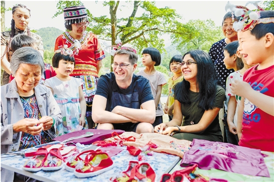 5月26日,湖州长兴县小浦镇方岩村,非物质文化遗产传承人潘正美老人正在教外国友人、少数民族居民、幼儿园小朋友制作虎头鞋。端午佳节,大家通过学习包粽子、缝香囊、制虎头鞋等民俗,一起体验中国传统的端午文化。 谭云俸 张泽民 摄