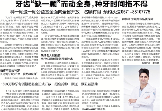 本周日(7月2日)上午9时30分,本报健康养生会理事单位杭州美奥口腔高难度、典型种植牙案例分享会同步开启。拨打本报咨询热线报名,即可享:免费全景拍片、牙槽骨骨量评估;免费定制全套种牙方案;多家欧美进口种植体援助,指定进口植体种一颗送一颗;爱牙礼包一份;更有机会获德国种植牙大咖联合会诊。本次活动还有少数名额,需提前预约,先约先得。