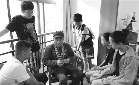 | 新荷小队探访 抗战老兵 7月30日,杭州五云山疗养院里抗战老兵郝龙清的住处来了几位小客人。杭州市采荷实验教育集团钱江新城实验学校715班新荷小队的队员们利用暑期社会实践的机会,寻访英雄人物,接受红色教育。当天,队员们认真倾听郝龙清回忆战火纷飞的往事。 本报记者 吴剑咏 |