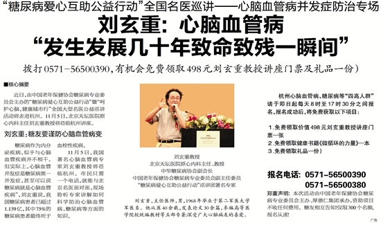 近日,由中国老年保健协会糖尿病专业委员会主办的“糖尿病爱心互助公益行动”暨“呵护心脑,健康城市行”全国大型名医公益巡讲活动将走进杭州。11月5日,北京天坛医院原心内科主任刘玄重教授将莅临杭州讲座。