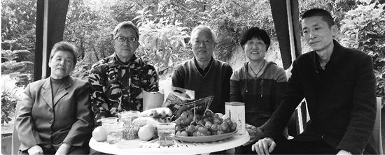 施东海(右一)陪父母、大妈大伯(左一、左二)喝茶聊天。