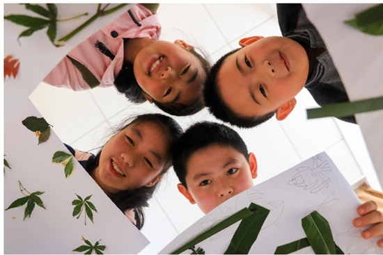 在“银巢”学习的孩子们展示自己的树叶画作品。