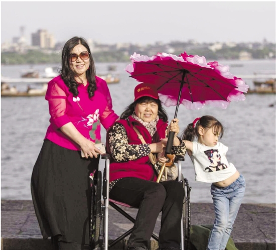 5月2日,祖孙三人在西湖白堤合影。外孙女的POSE和轮椅上的红伞,让外婆开心地笑了起来。