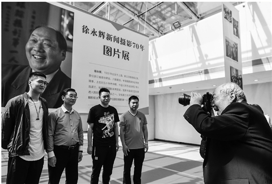 在图片展上,徐永辉(右一)为他跟踪拍摄的家庭代表拍摄合影。 本报记者 董旭明 魏志阳 摄