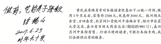 黄氏益寿强身膏对本报读者优惠如下:6瓶一疗程,服用3个月左右,零售价2388元,优惠价2000元。杭州胡庆余堂、方回春堂、北京同仁堂杭州平海路分号,绍兴市区震元堂总店,嘉兴老百姓大药房总店(勤俭路991号),嘉兴月河中医馆有售。行动不便的读者,可拨打本版专线,我们会提供应有的服务。