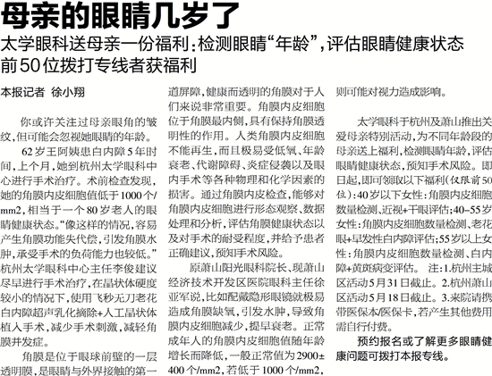 太学眼科于杭州及萧山推出关爱母亲特别活动,为不同年龄段的母亲送上福利,检测眼睛年龄,评估眼睛健康状态,预知手术风险。即日起,即可领取以下福利(仅限前50位):40岁以下女性:角膜内皮细胞数量检测、近视+干眼评估;40-55岁女性:角膜内皮细胞数量检测、老花眼+早发性白内障评估;55岁以上女性:角膜内皮细胞数量检测、白内障+黄斑病变评估。 注:1.杭州主城区活动5月31日截止。2.杭州萧山区活动5月18日截止。3.来院请携带医保本/医保卡,若产生其他费用需自行付费。